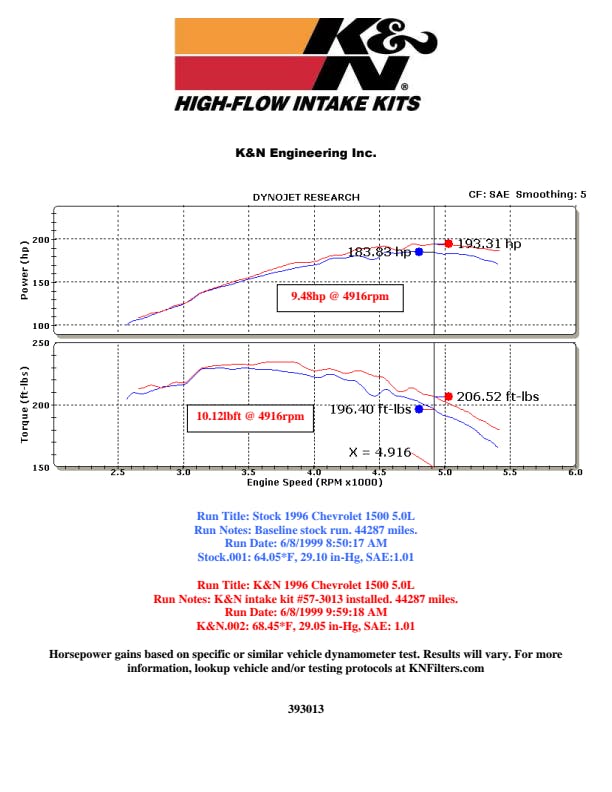 - DYNO TESTING YOU CAN TRUST: K&N air intake horsepower/torque testing is performed on wheel-based dynamometers and the reports are included with each intake system.