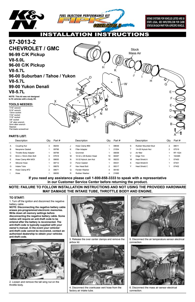 K&N is the inventor of the Air Intake System and has over 50 years of experience in the performance filtration industry. Proudly designed and manufactured in the USA, this premium cold air intake system is specifically designed for your C1500, C2500, C35, C3500, K1500, K2500, K3500, Suburban 1500, Tahoe, Yukon, and is dyno tested to provide a guaranteed increase in horsepower. It features a high flow intake tube, custom heat shield, and oversized K&N Washable High-Flow Cotton Air Filter for ultimate airflow. This Intake system replaces the restrictive OEM air box to provide an improved driving experience for daily driving or towing. It installs easily in about 60 minutes and is backed by a No-Hassle Lifetime Limited Warranty and will not void your factory warranty.