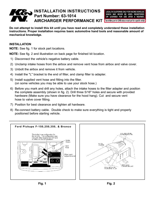 The K&N AirCharger 63-1014 air intake system replaces your vehicle's restrictive factory air filter and air intake housing. K&N intakes are designed to dramatically reduce intake restriction as they smooth and straighten air flow. This allows your vehicle's engine to inhale a larger amount of air than the factory air filter assembly. More air means more usable power and acceleration throughout the engine's RPM range. The 63-1014 air intake comes with a chrome topped K&N high-flow air filter that clamps onto the air intake hoses giving you a guaranteed power gain. The oversized air filter can be used for up to 100,000 miles before servicing is needed depending on driving conditions. This air intake is relatively easy to install using commonly available tools.